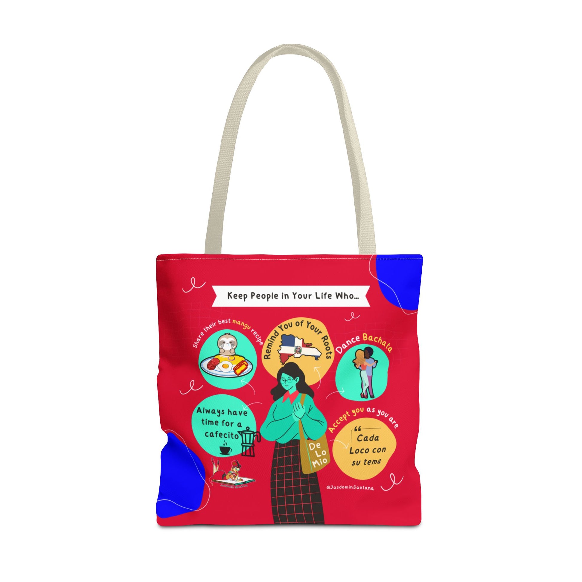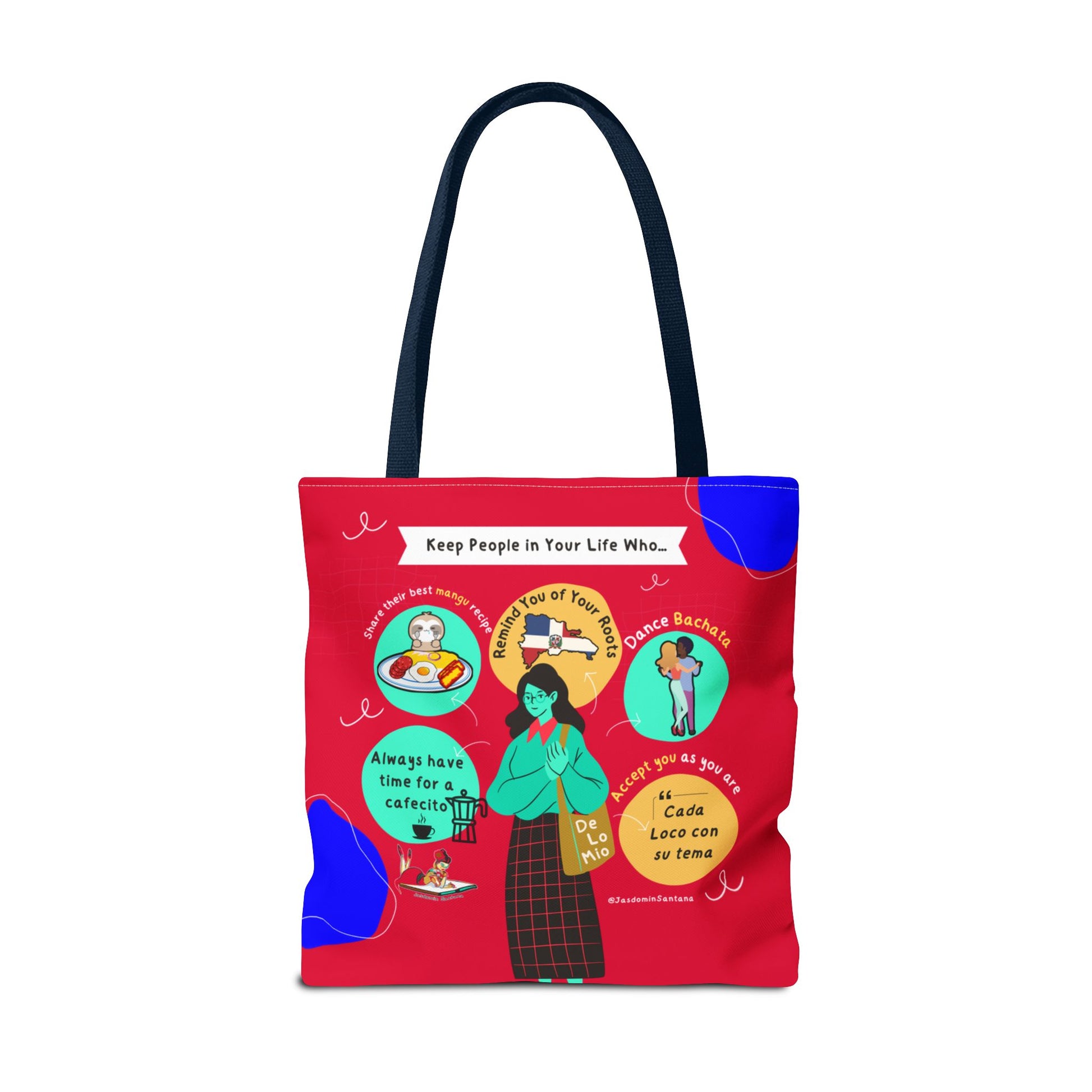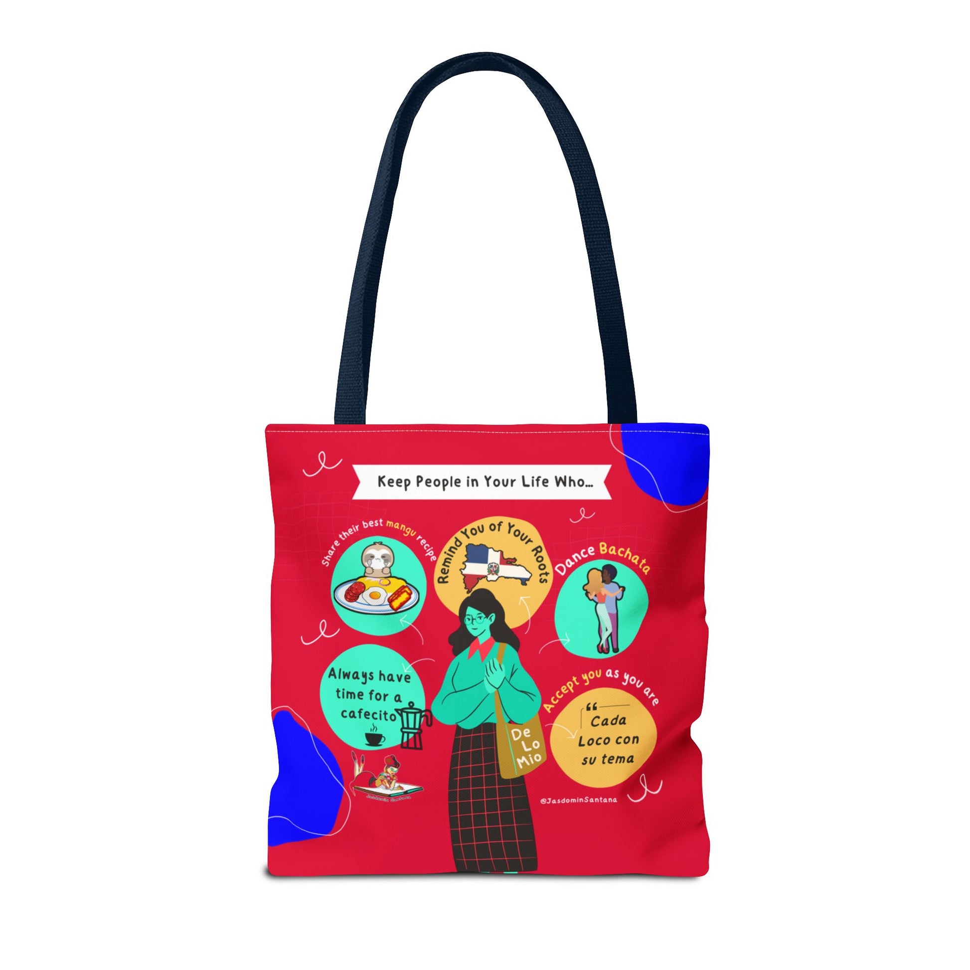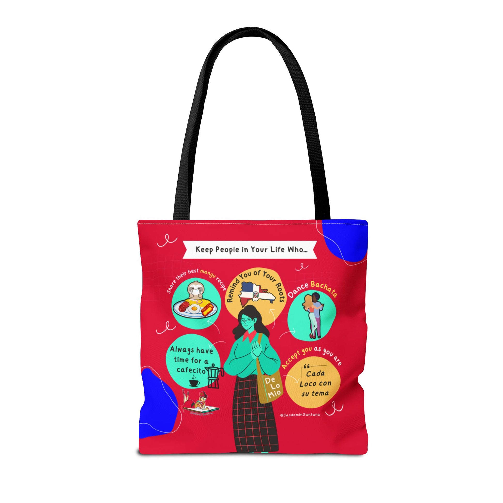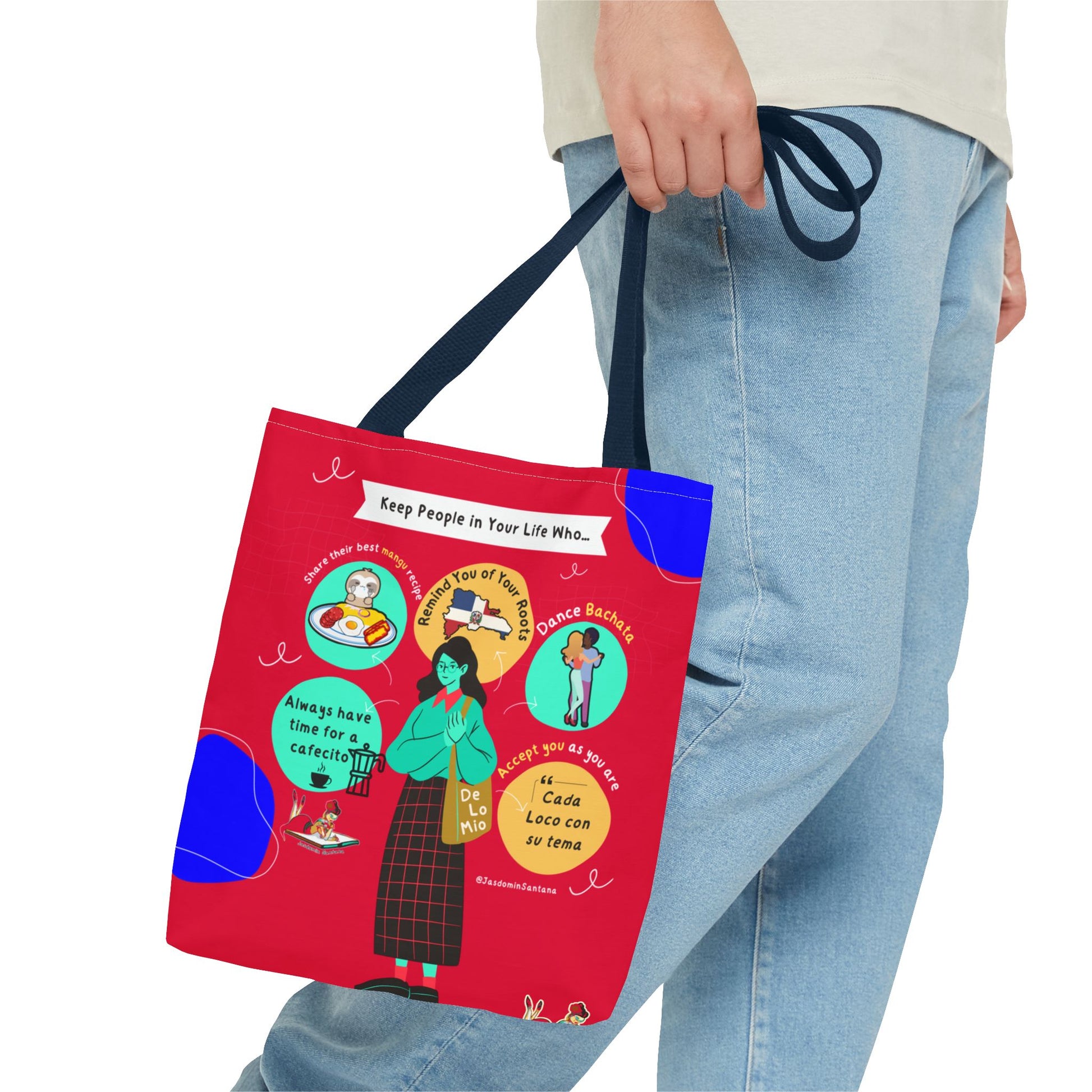 Carry a little wisdom and a lot of style with our "Keep People in Your Life Who..." Dominican Tote Bag! This practical accessory is perfect for spreading positivity and celebrating the little things that make life special. Adorned with delightful sayings like "who dance bachata," "who have time for a cafecito," and more, this tote is a reminder to cherish the moments and people that bring joy to your life. Makes the perfect everyday bag and unique gift!