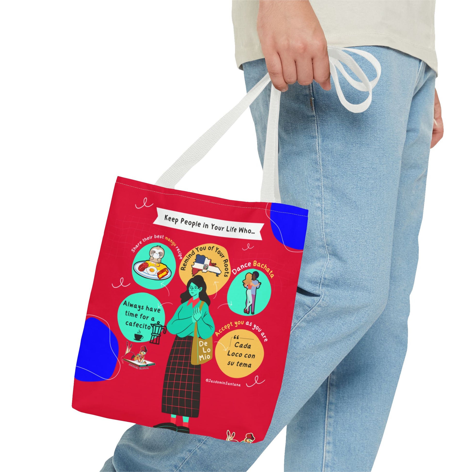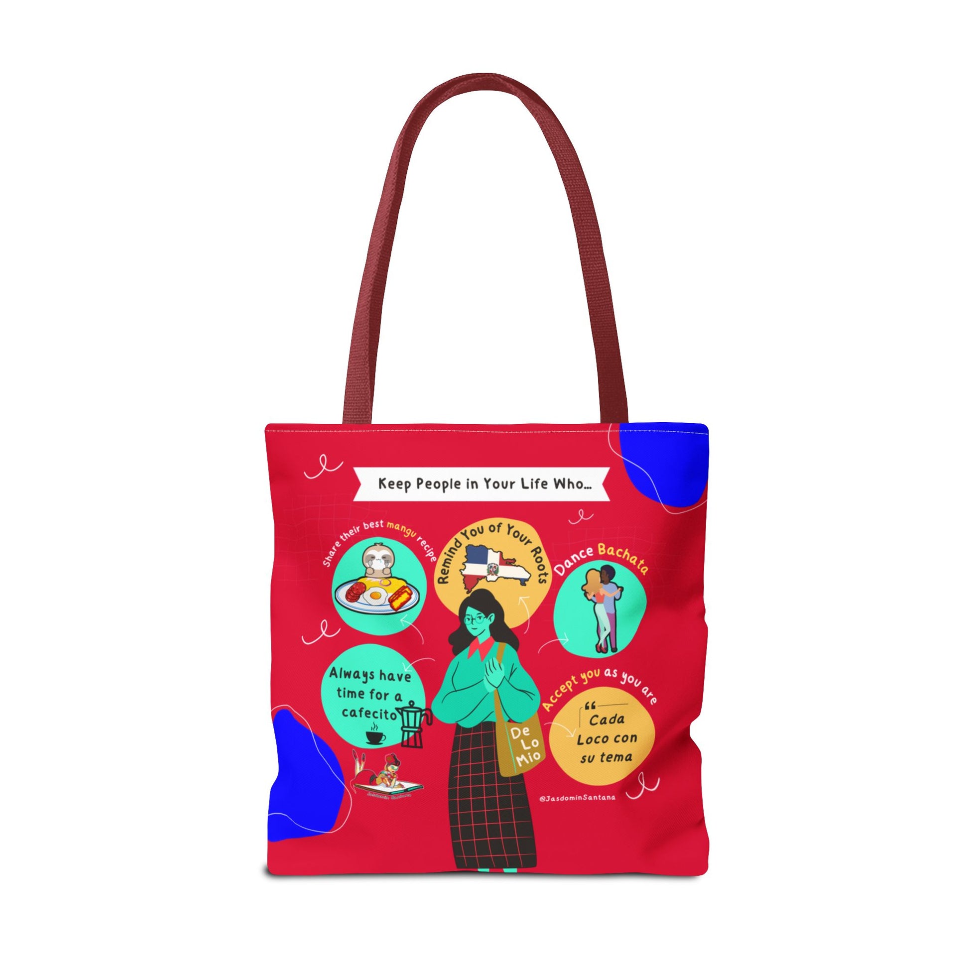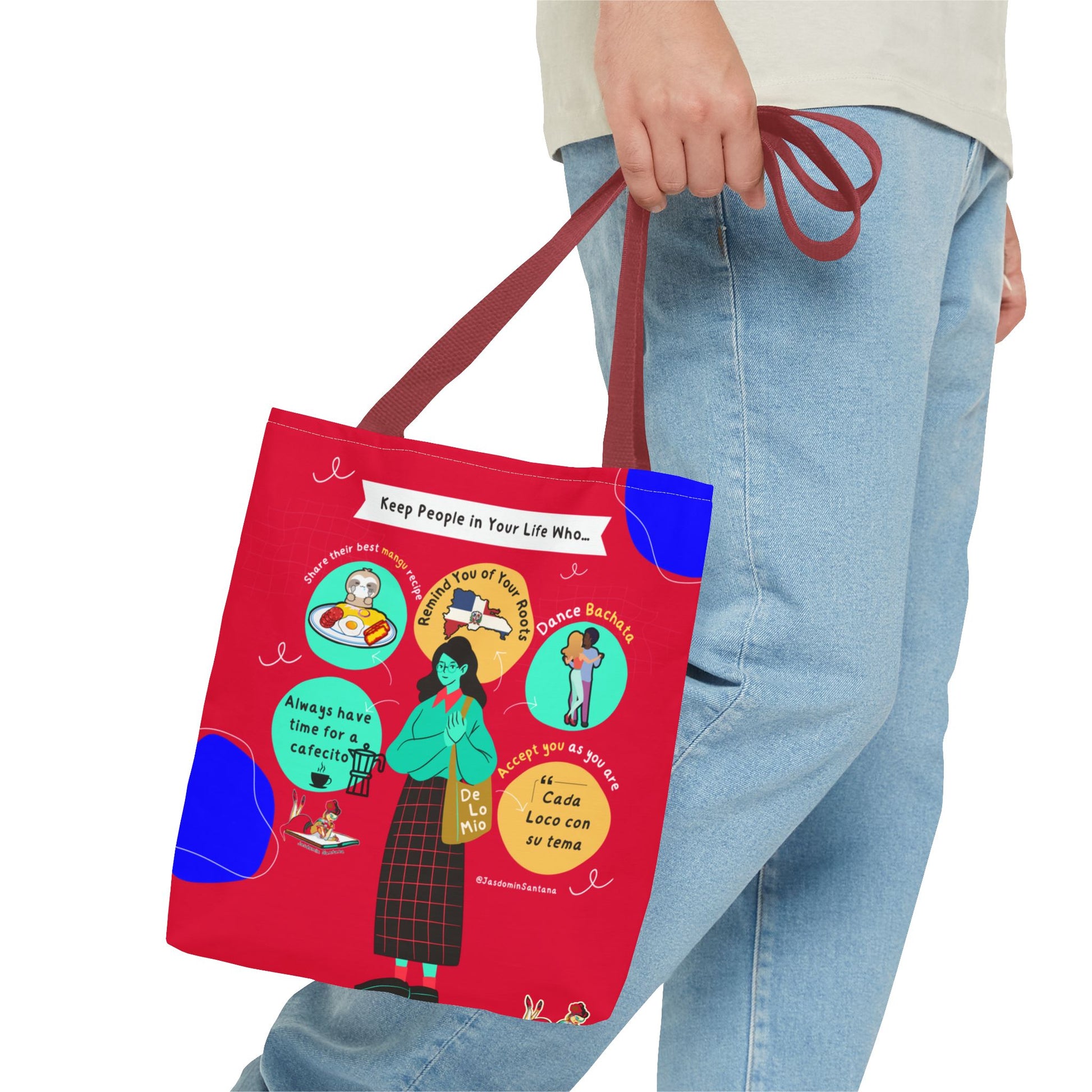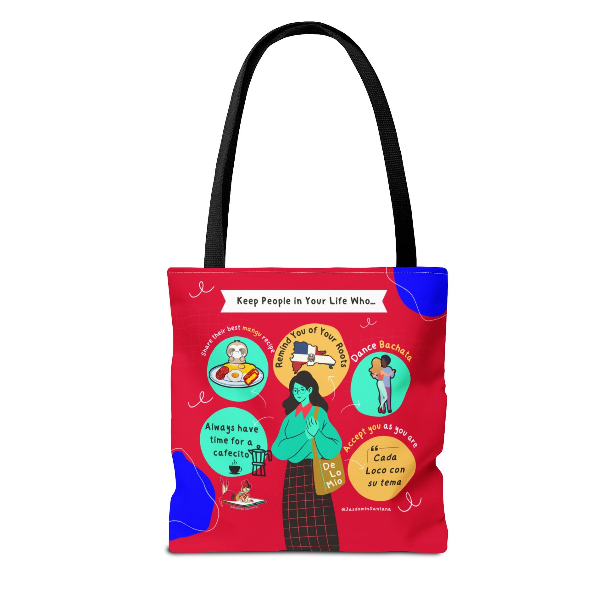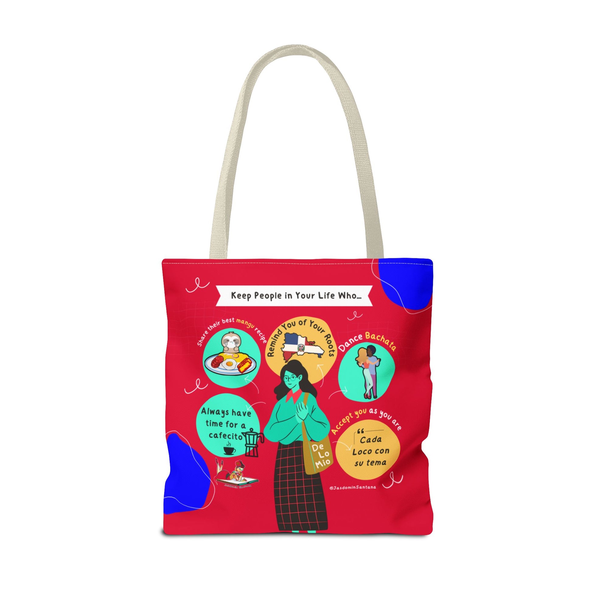 Carry a little wisdom and a lot of style with our "Keep People in Your Life Who..." Dominican Tote Bag! This practical accessory is perfect for spreading positivity and celebrating the little things that make life special. Adorned with delightful sayings like "who dance bachata," "who have time for a cafecito," and more, this tote is a reminder to cherish the moments and people that bring joy to your life. Makes the perfect everyday bag and unique gift!