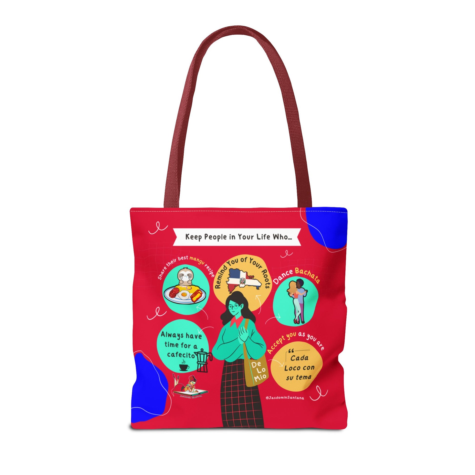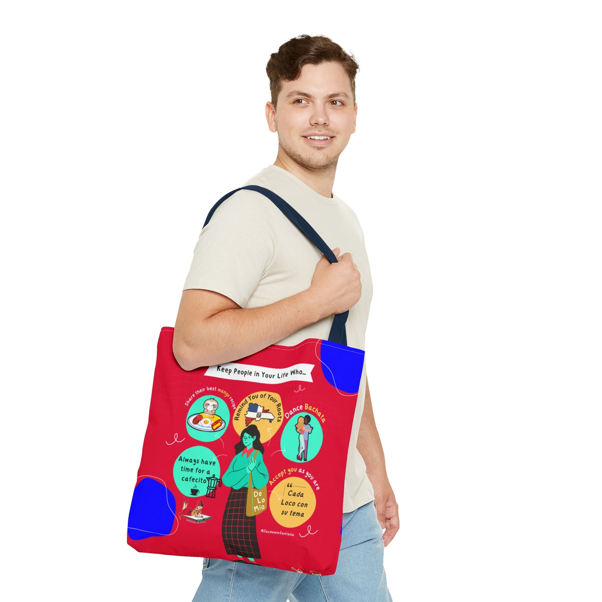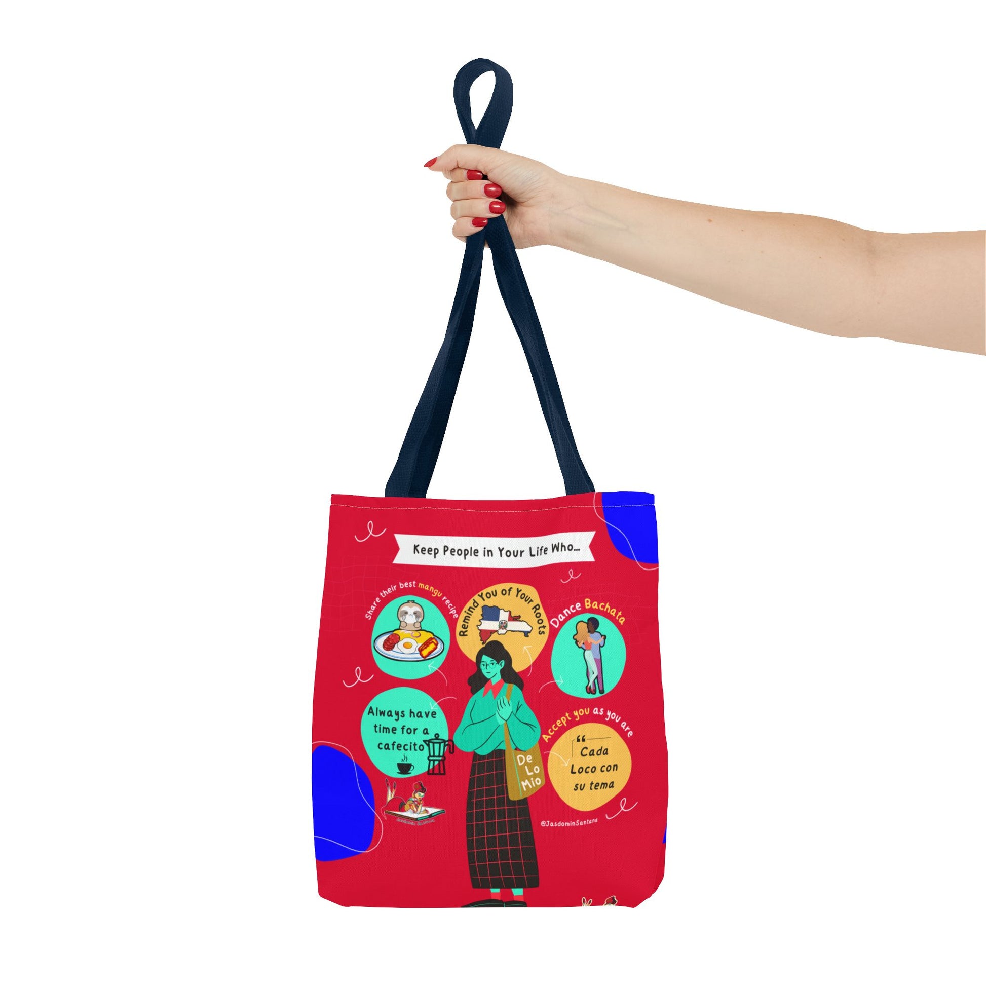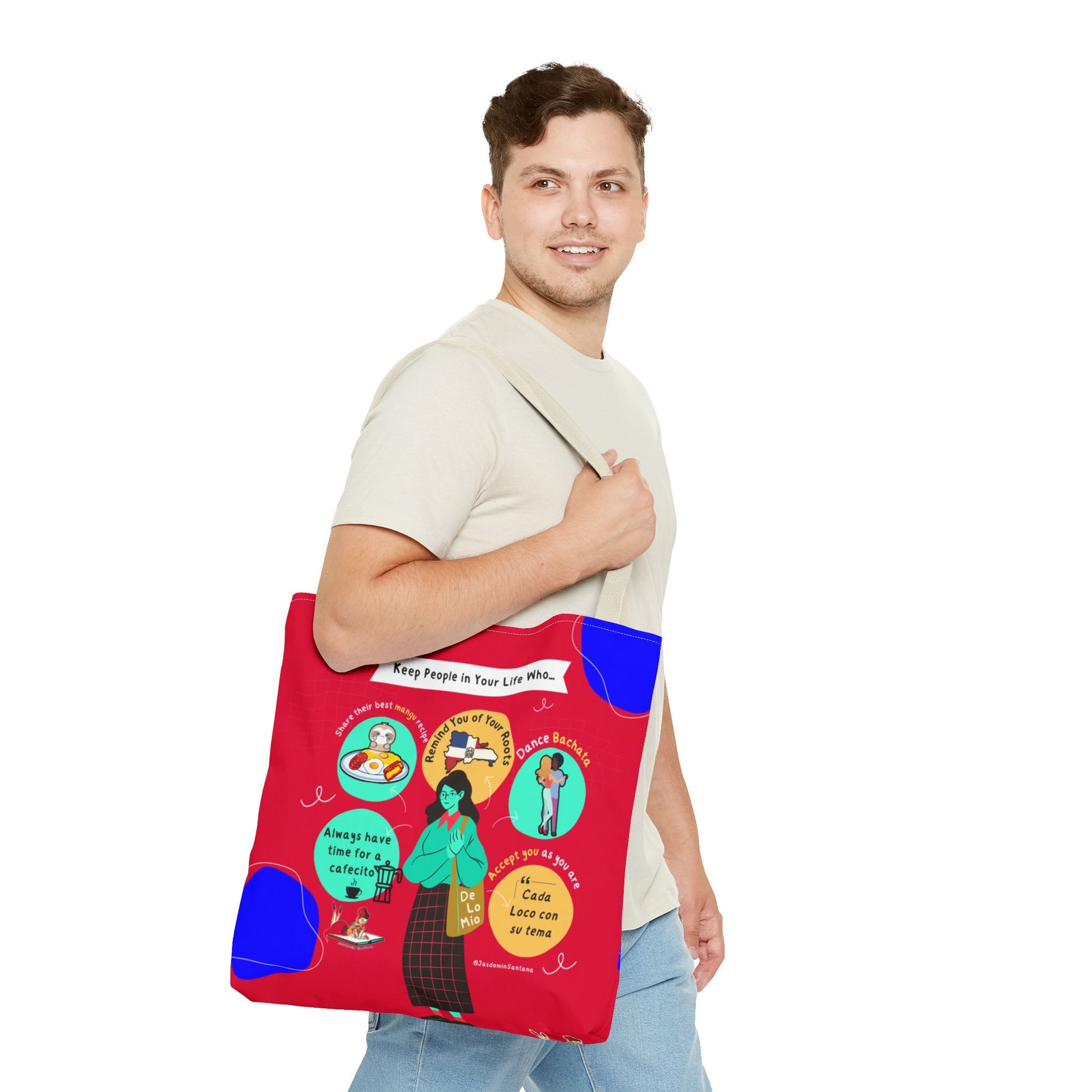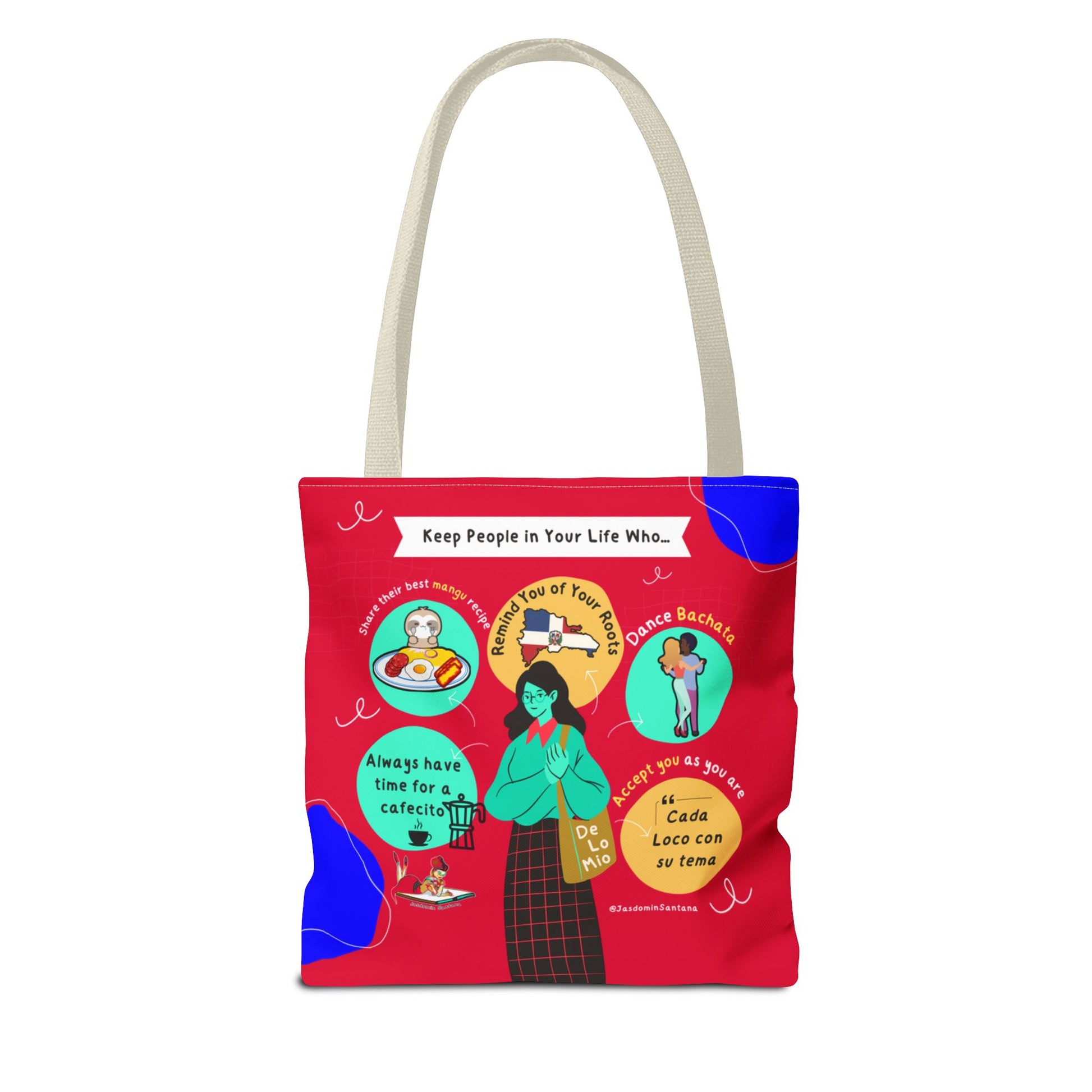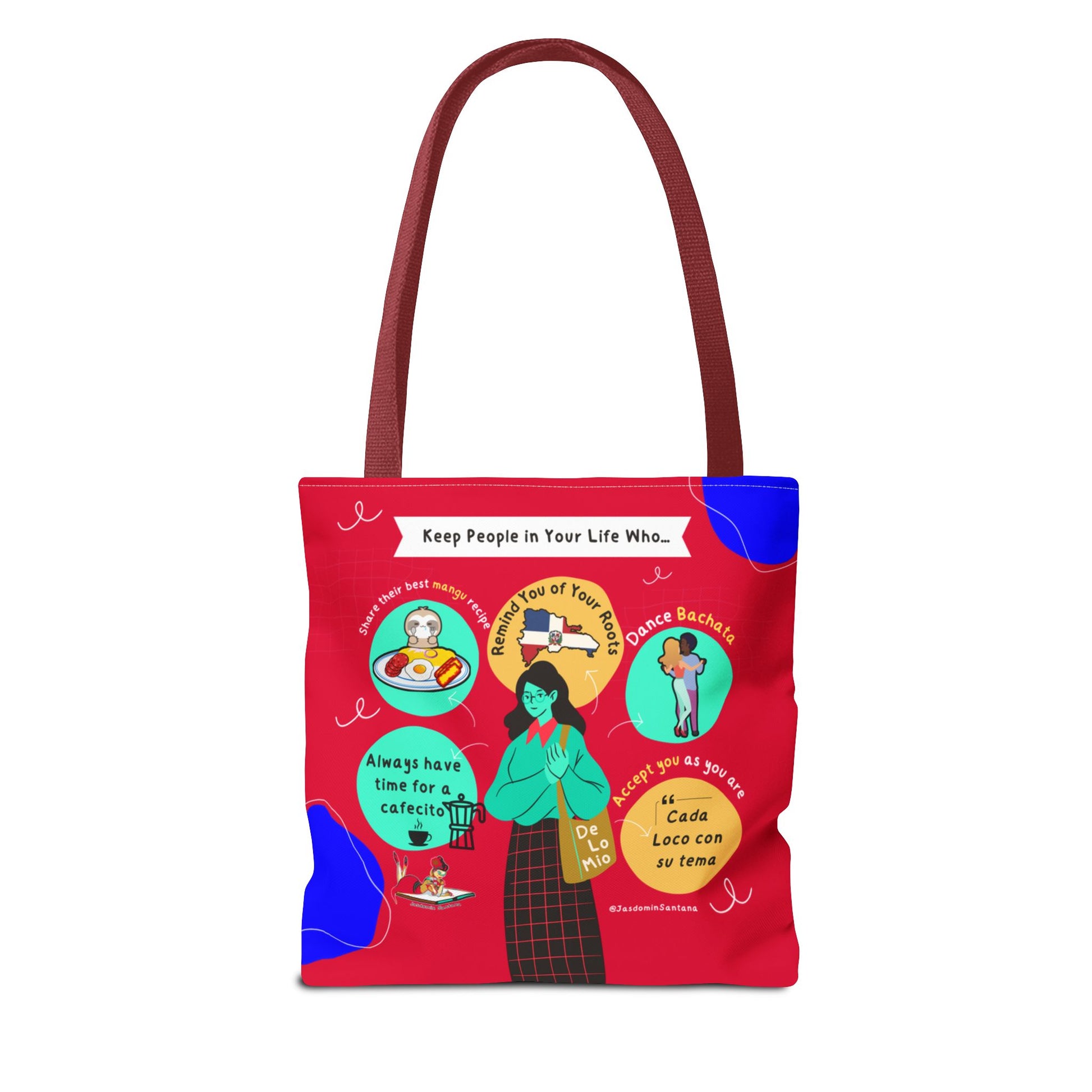 Carry a little wisdom and a lot of style with our "Keep People in Your Life Who..." Dominican Tote Bag! This practical accessory is perfect for spreading positivity and celebrating the little things that make life special. Adorned with delightful sayings like "who dance bachata," "who have time for a cafecito," and more, this tote is a reminder to cherish the moments and people that bring joy to your life. Makes the perfect everyday bag and unique gift!
