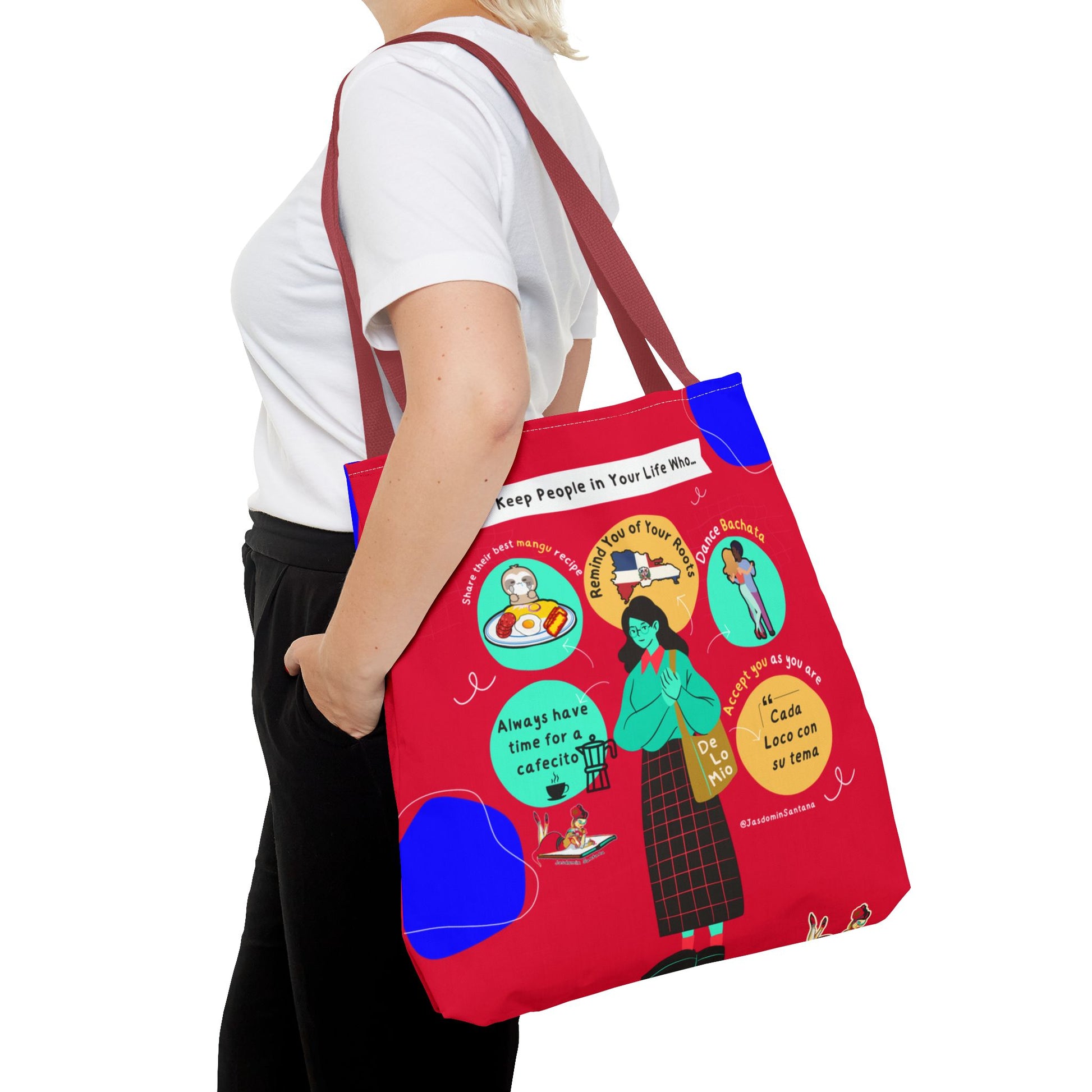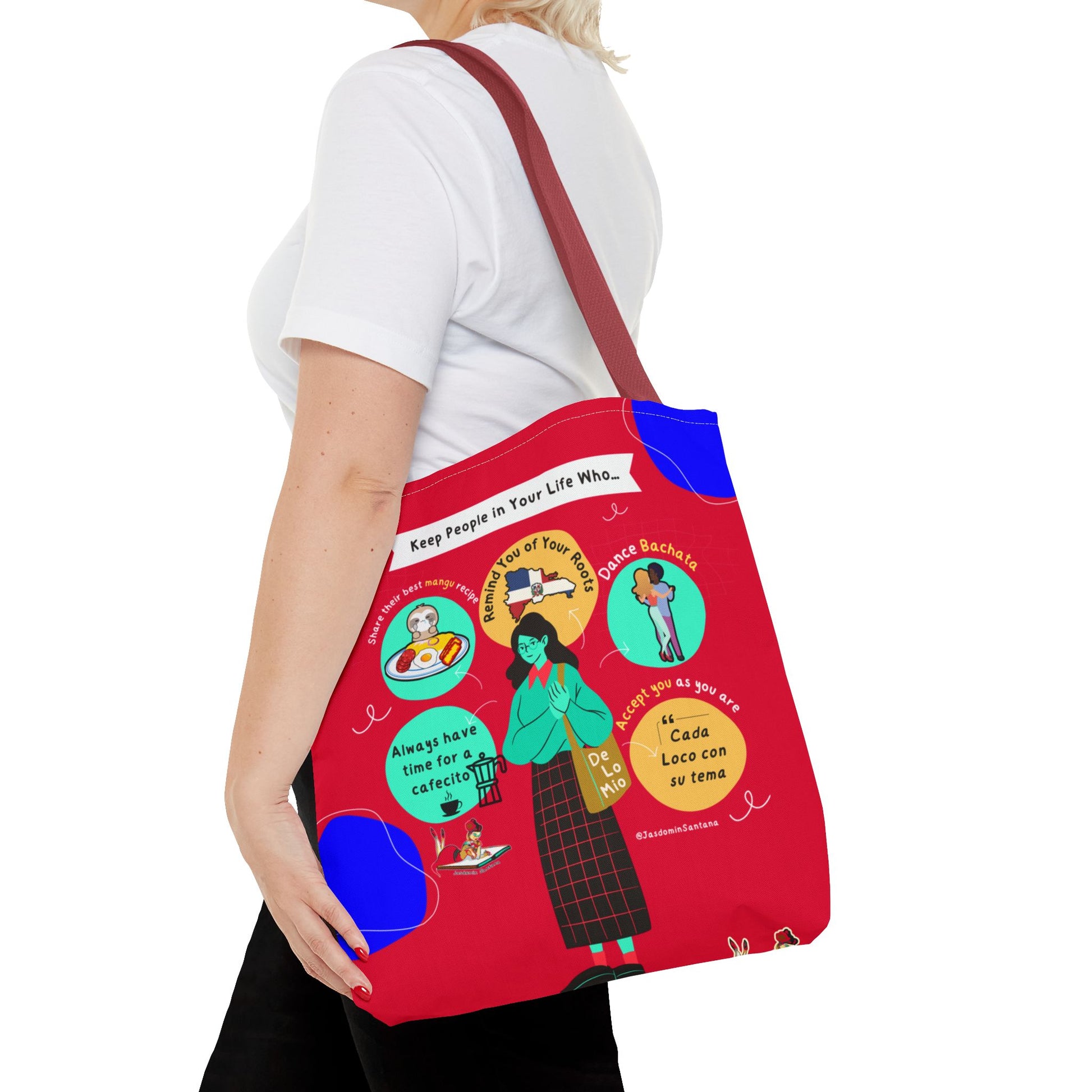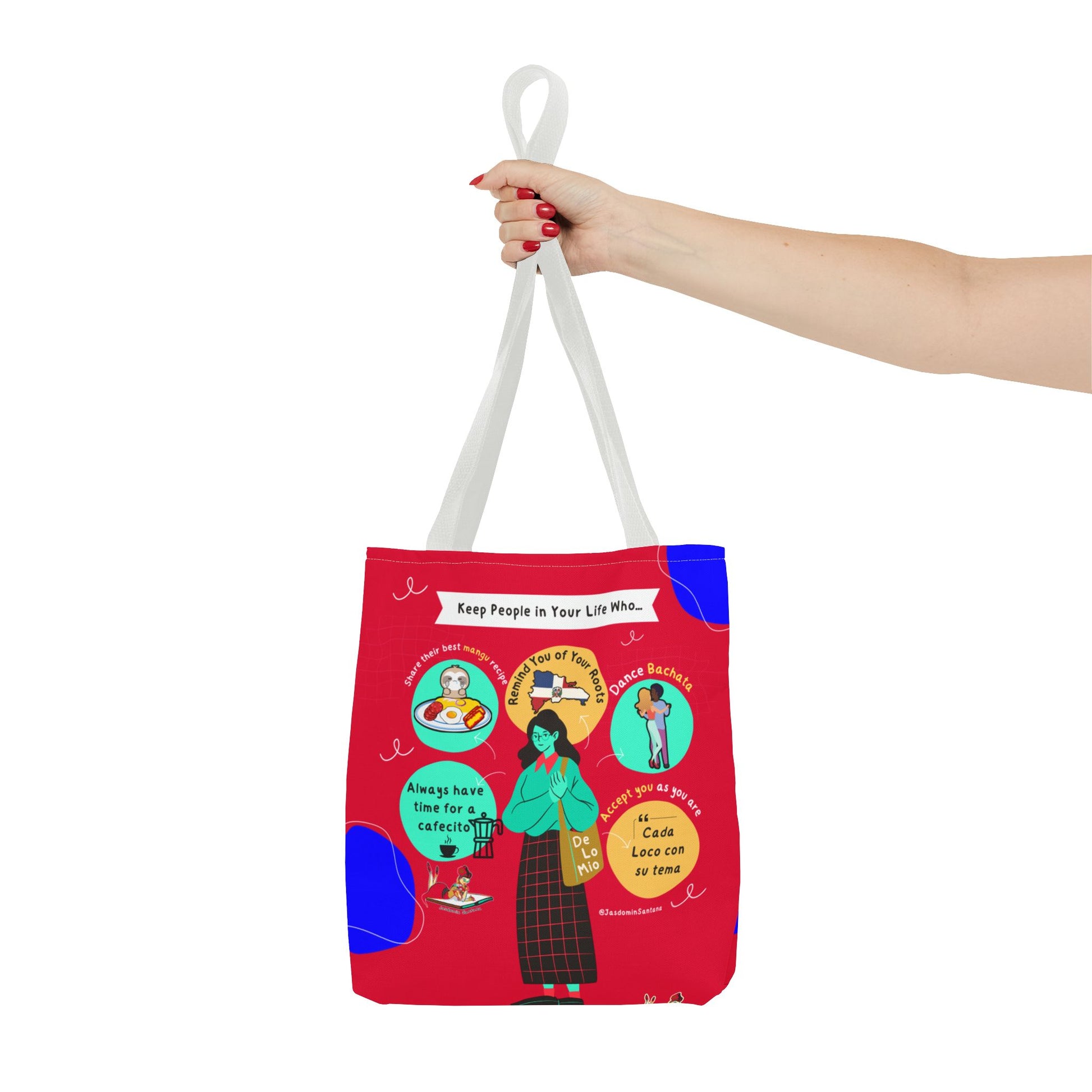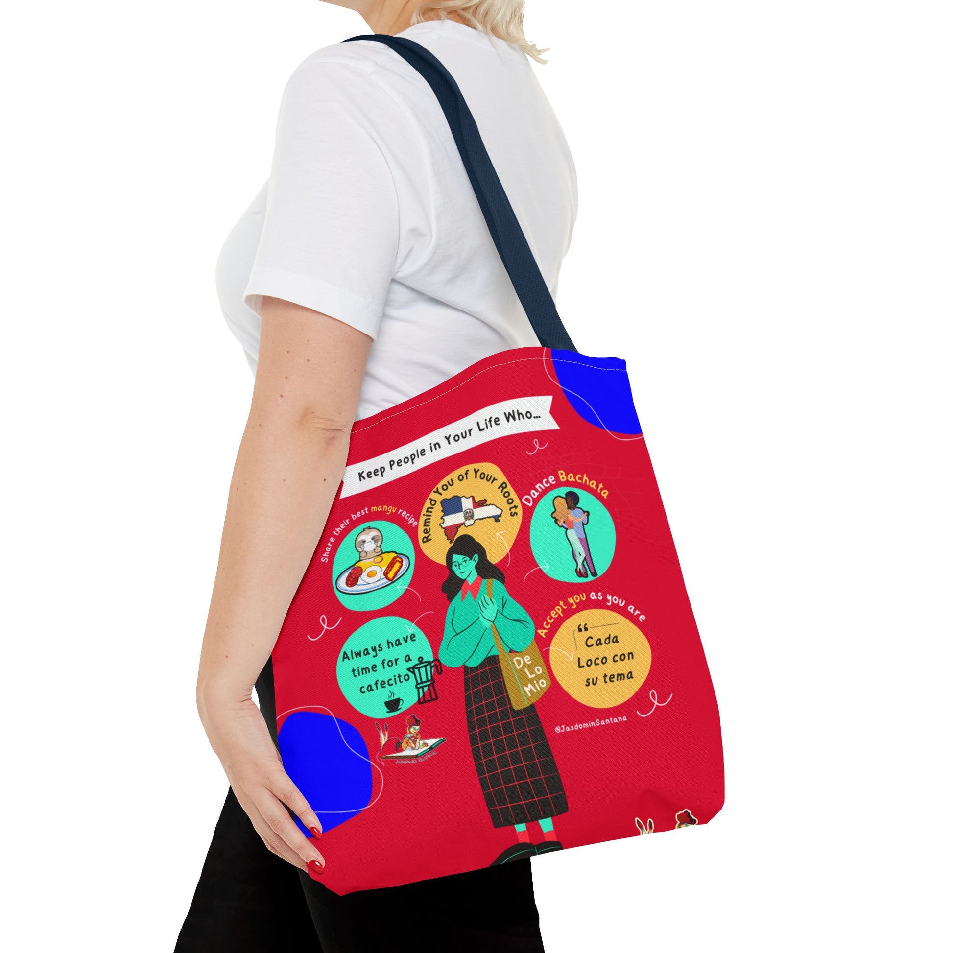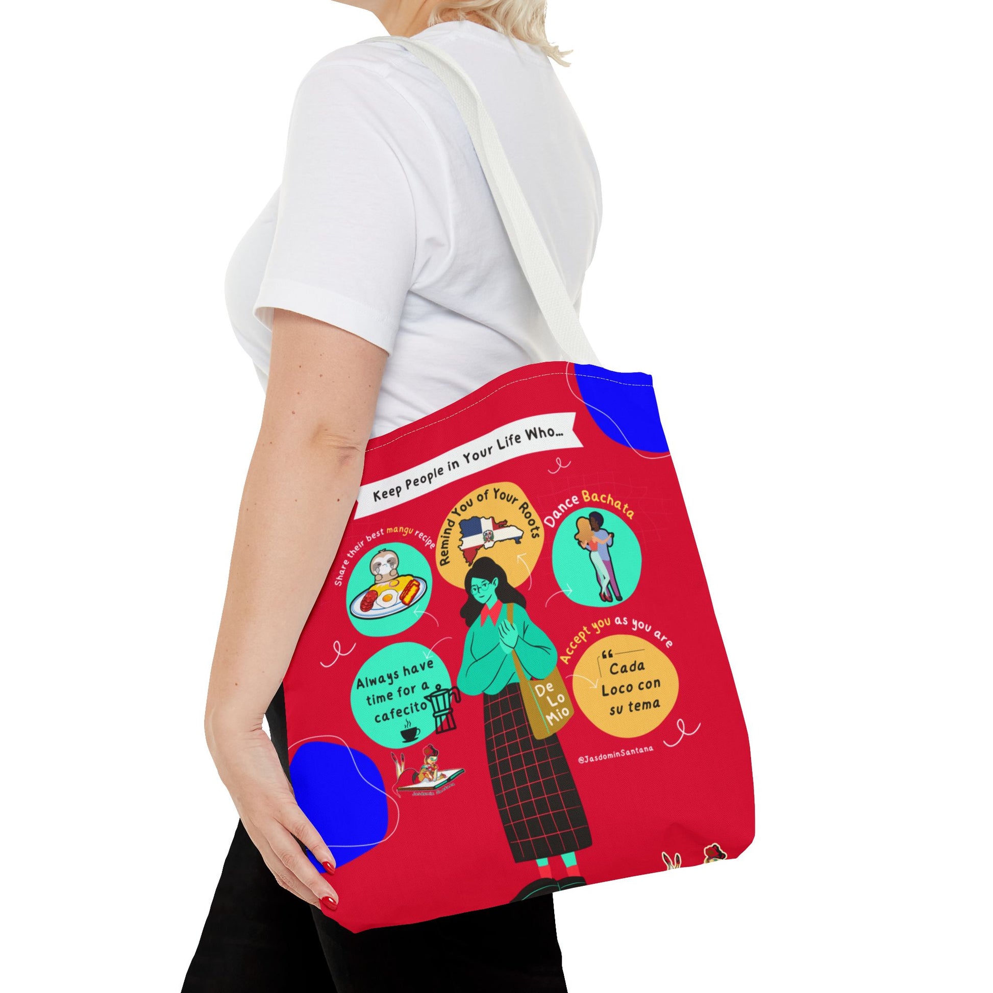 Carry a little wisdom and a lot of style with our "Keep People in Your Life Who..." Dominican Tote Bag! This practical accessory is perfect for spreading positivity and celebrating the little things that make life special. Adorned with delightful sayings like "who dance bachata," "who have time for a cafecito," and more, this tote is a reminder to cherish the moments and people that bring joy to your life. Makes the perfect everyday bag and unique gift!