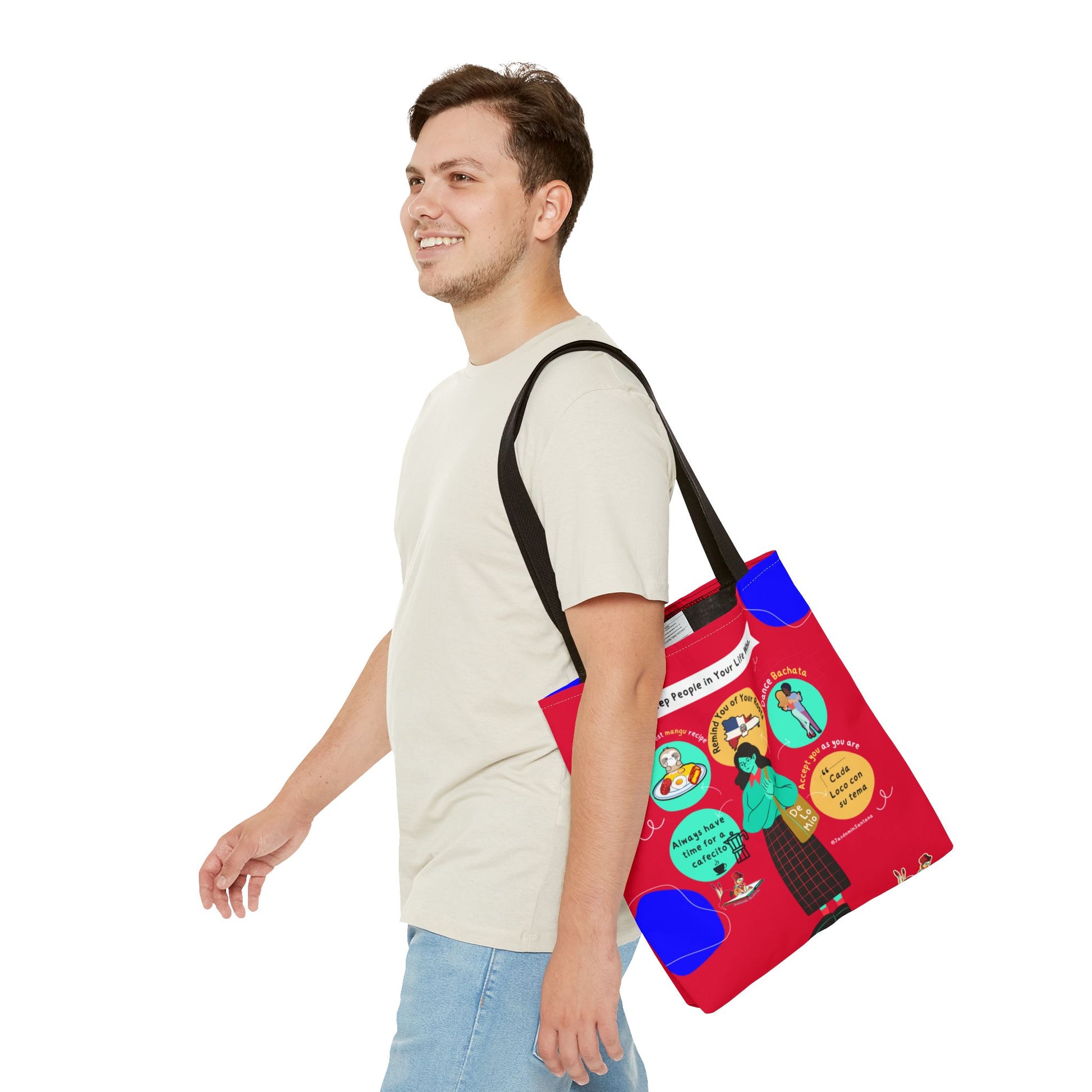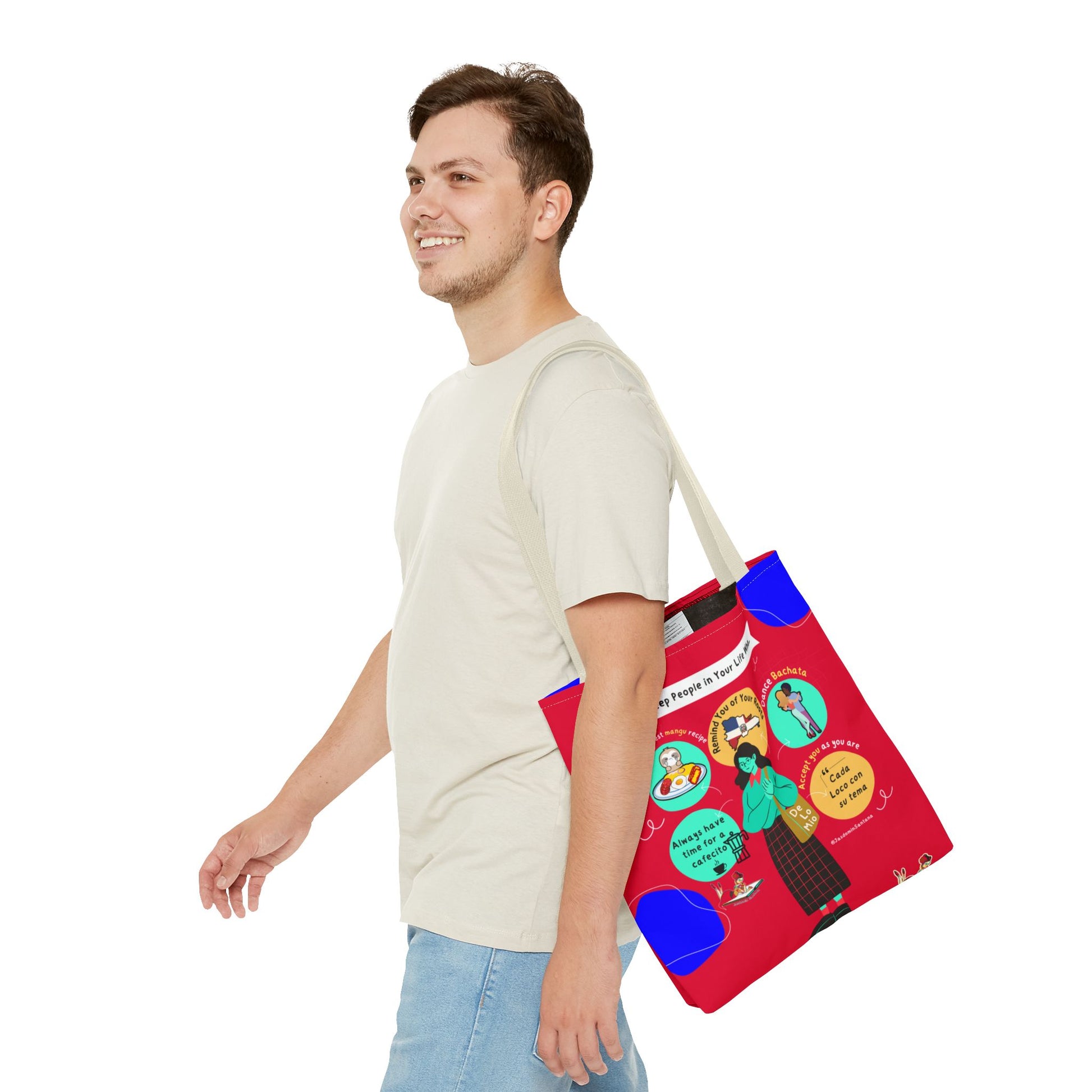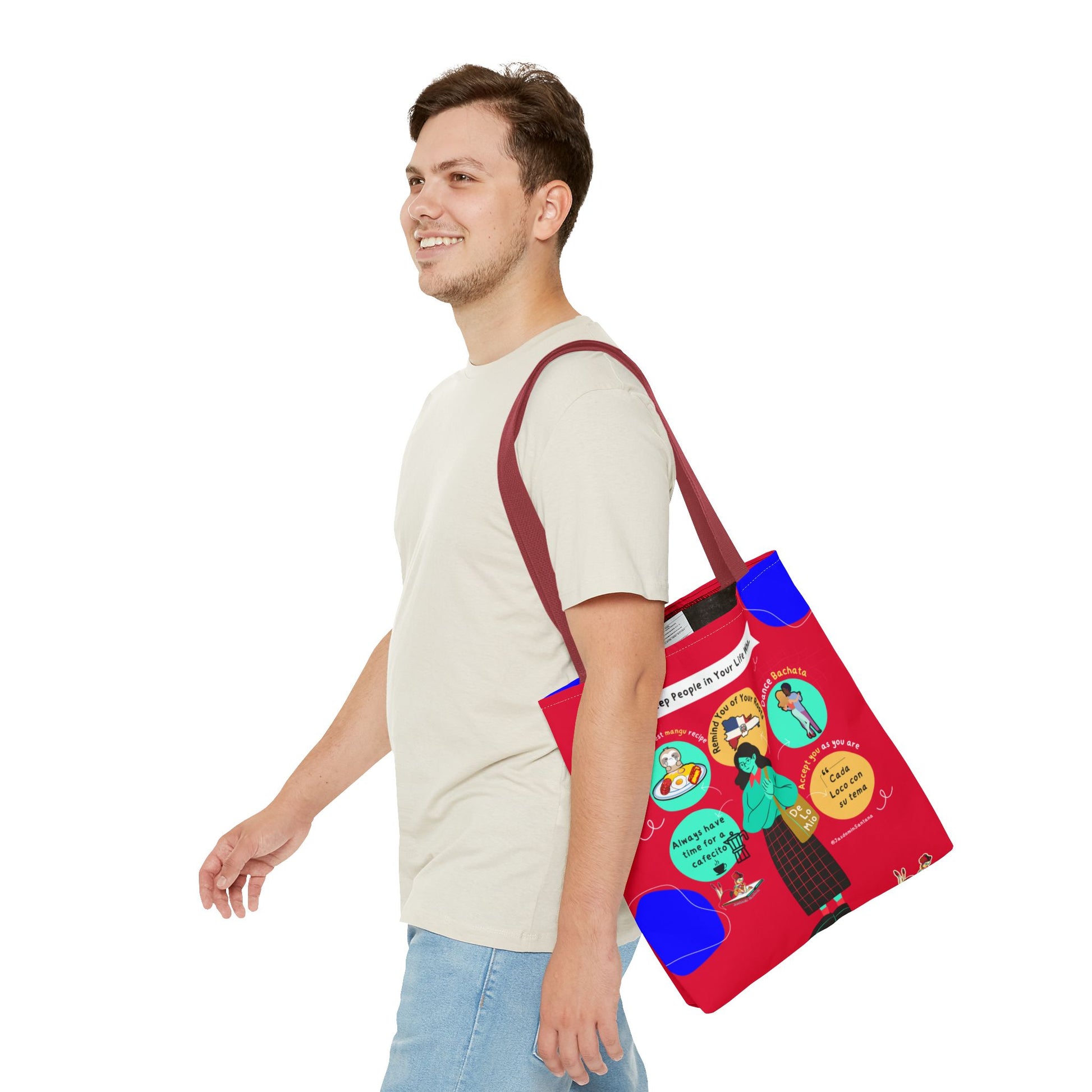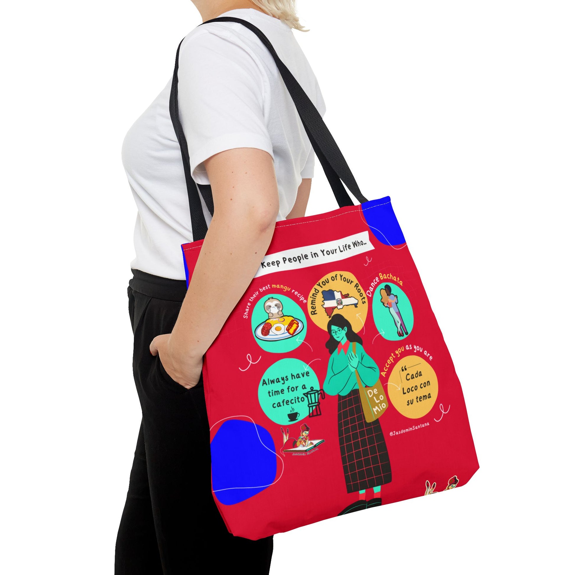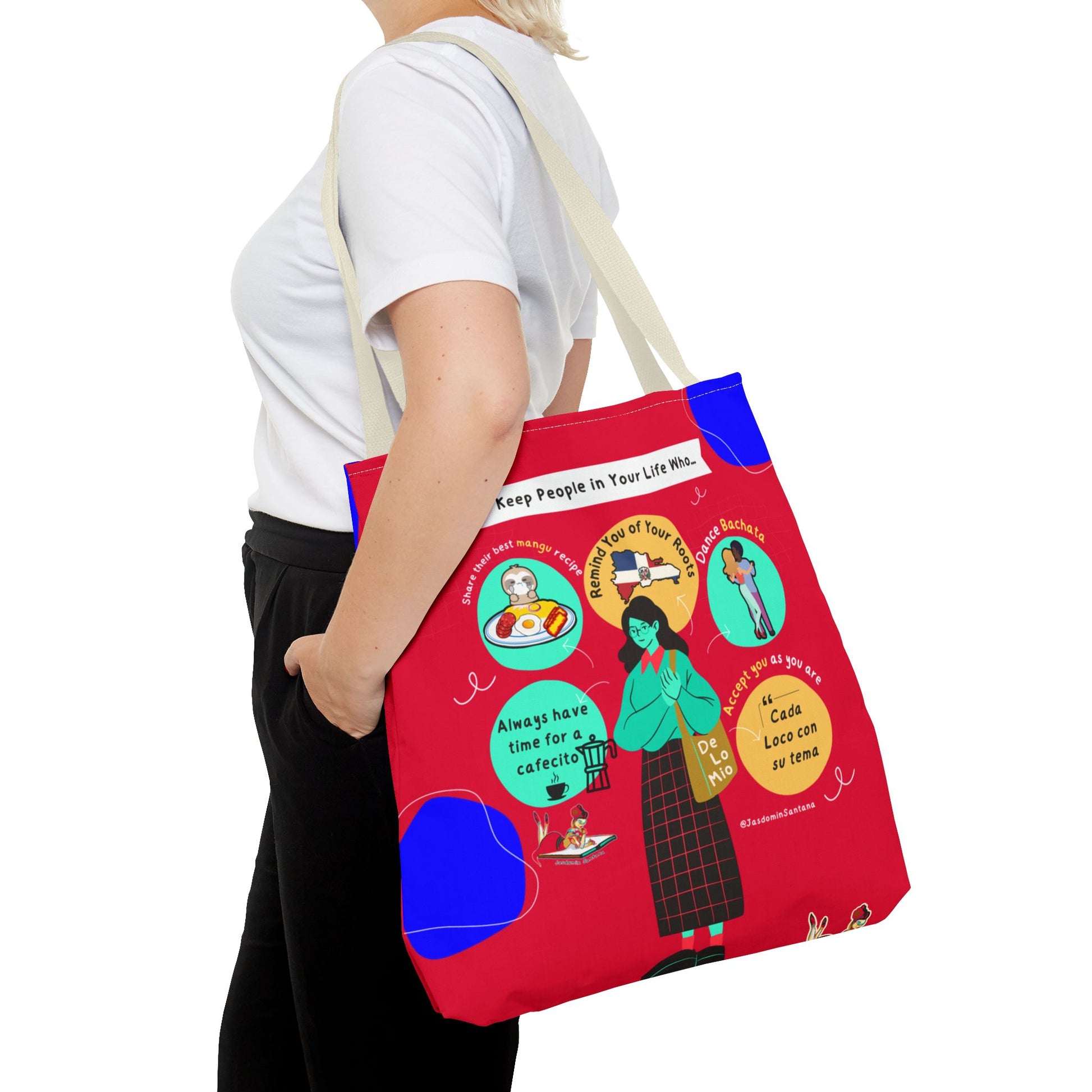 Carry a little wisdom and a lot of style with our "Keep People in Your Life Who..." Dominican Tote Bag! This practical accessory is perfect for spreading positivity and celebrating the little things that make life special. Adorned with delightful sayings like "who dance bachata," "who have time for a cafecito," and more, this tote is a reminder to cherish the moments and people that bring joy to your life. Makes the perfect everyday bag and unique gift!